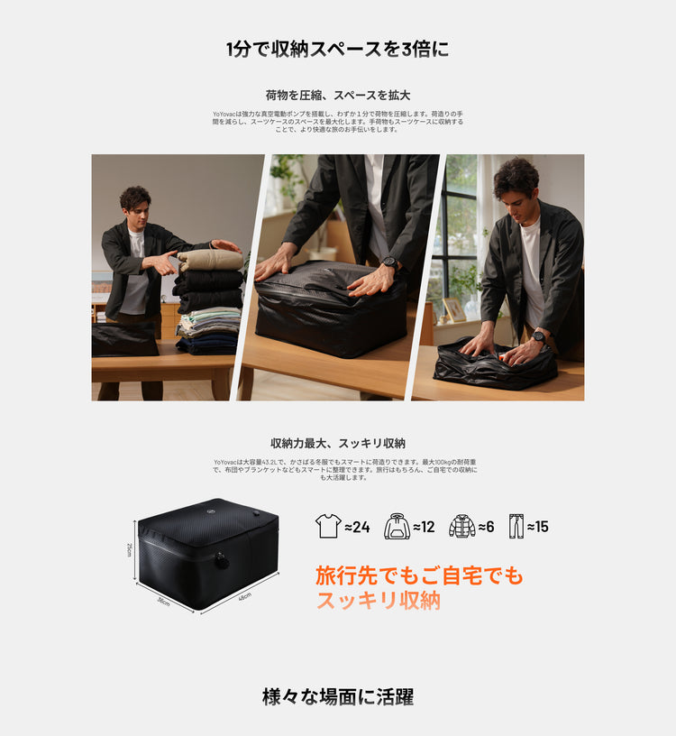 空気を抜いて、旅に出る追跡機能付き・圧縮トラベルバック